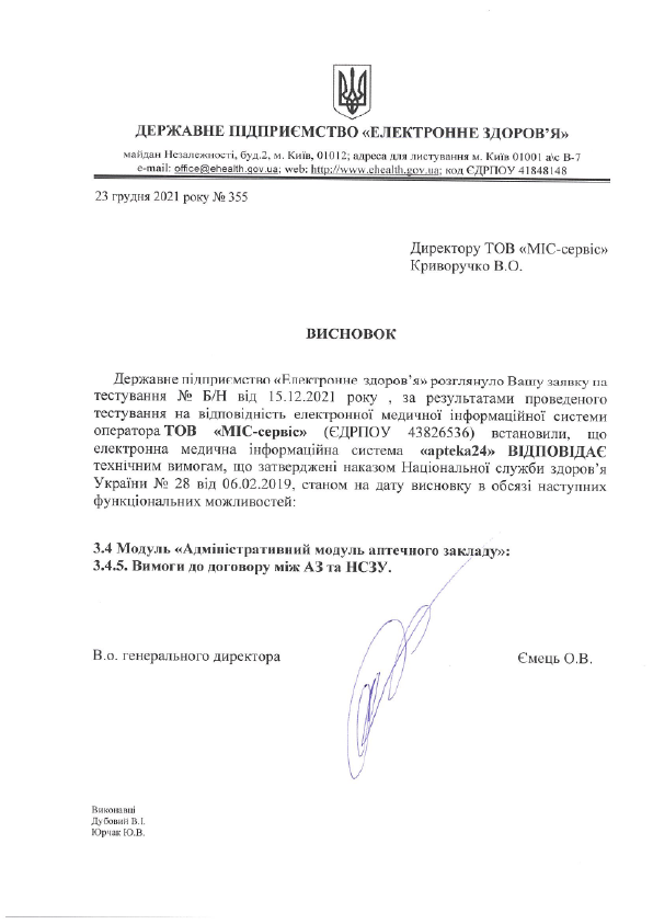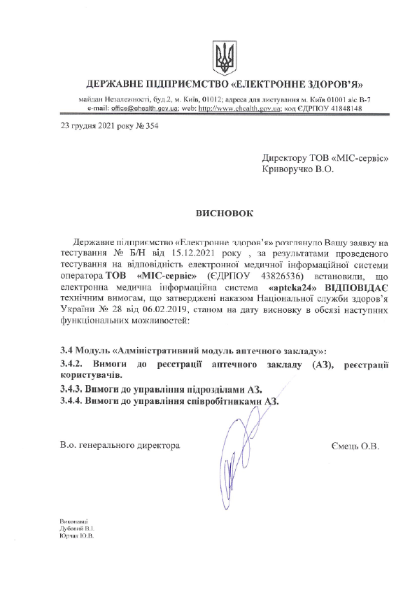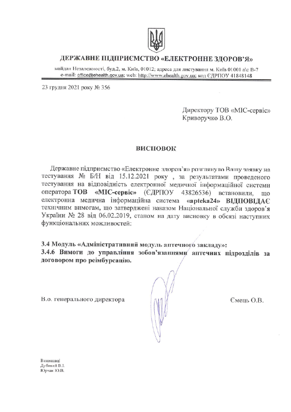 Відповідність МІС "apteka24" технічним вимогам НСЗУ